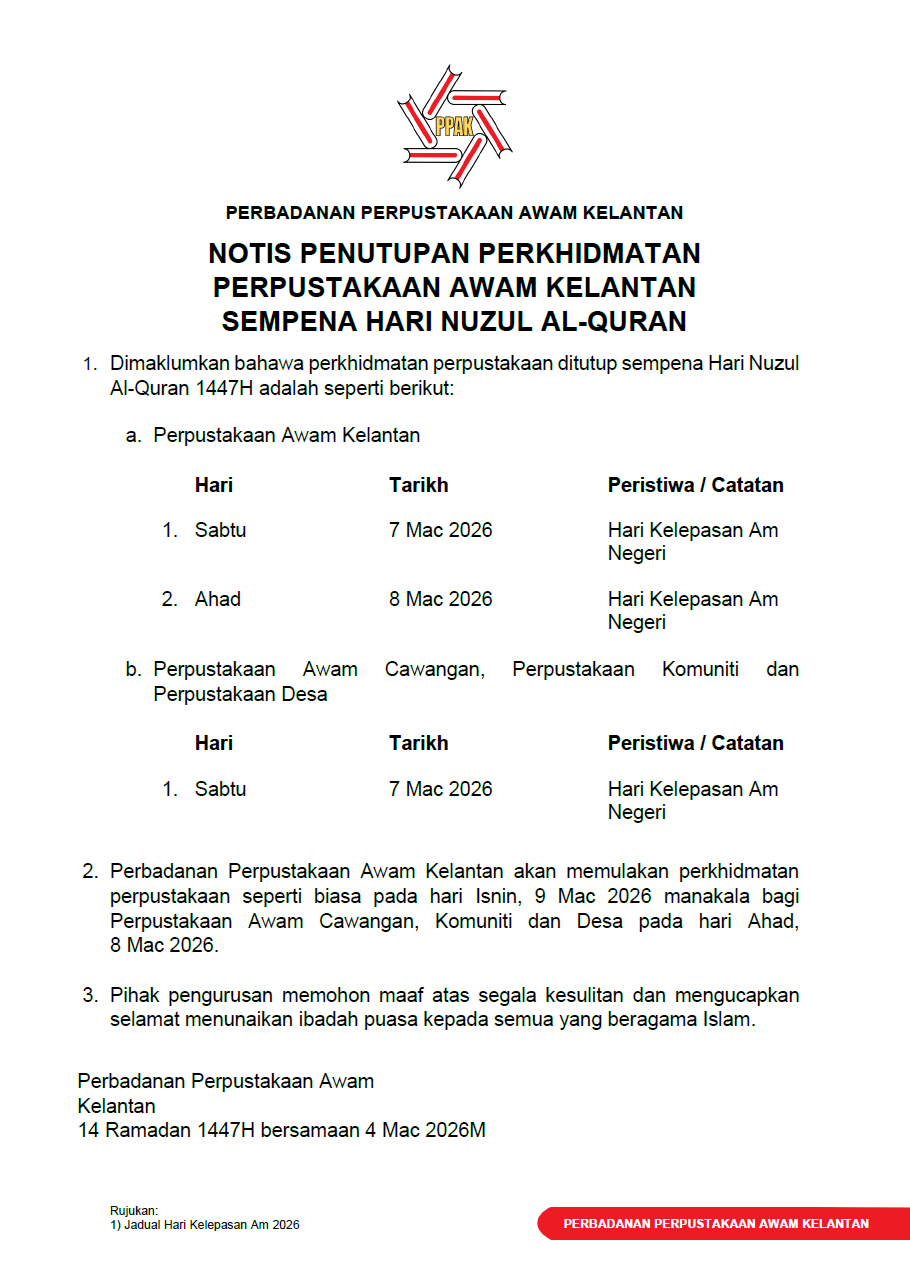 Notis penutupan perkhidmatan perpustakaan sempena Hari Nuzul Al-Quran 1447H Written by Pentadbir on 17 March 2025. Posted in Arkib pengumuman aktiviti. Artikel hanya terdapat dalam bahasa Melayu | Article available only in Malay Prev Next