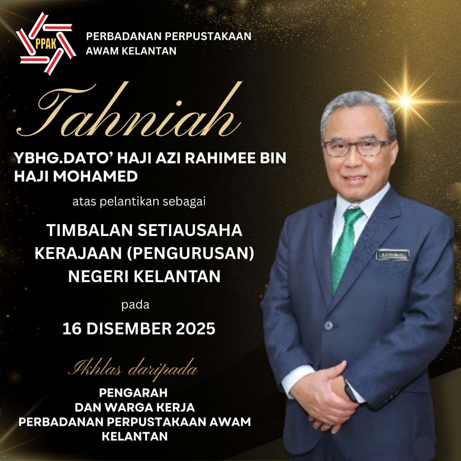 Ucapan Tahniah. Dengan penuh rasa hormat dan penghargaan, mengucapkan setinggi-tinggi tahniah kepada YBhg. Dato' Haji Azi Rahimee bin Haji Mohamed atas pelantikan sebagai Timbalan Setiausaha Kerajaan (Pengurusan) Negeri Kelantan. Semoga pelantikan ini membawa kejayaan dan kecemerlangan dalam menerajui Pentadbiran Kerajaan Negeri Kelantan. Ikhlas daripada Pengarah dan Warga Kerja Perbadanan Perpustakaan Awam Kelantan.