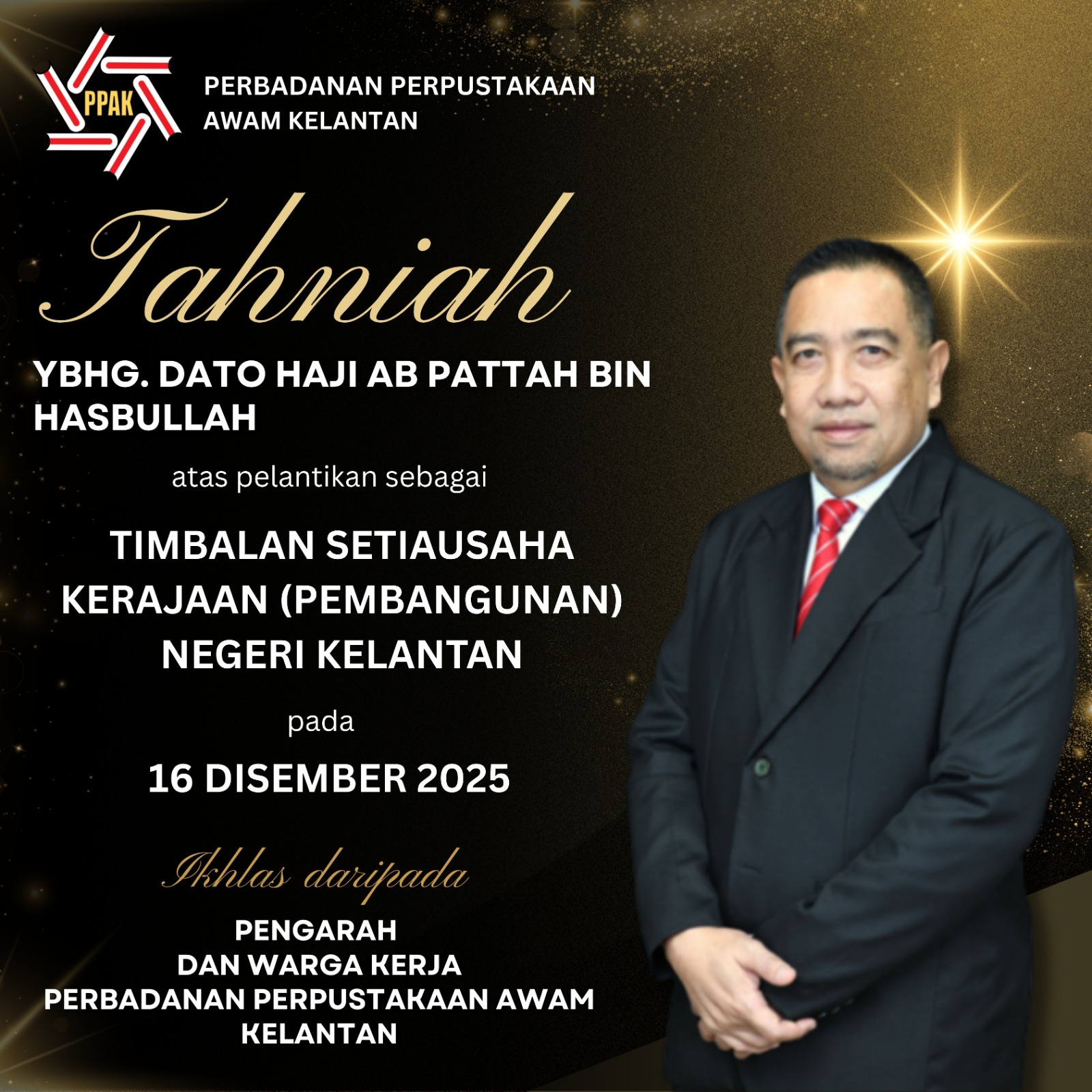 Ucapan Tahniah. Dengan penuh rasa hormat dan penghargaan, mengucapkan setinggi-tinggi tahniah kepada YBhg. Dato' Haji Ab Pattah bin Hasbullah atas pelantikan sebagai Timbalan Setiausaha Kerajaan (Pembangunan) Negeri Kelantan. Semoga pelantikan ini membawa kejayaan dan kecemerlangan dalam menerajui Pentadbiran Kerajaan Negeri Kelantan. Ikhlas daripada Pengarah dan Warga Kerja Perbadanan Perpustakaan Awam Kelantan.