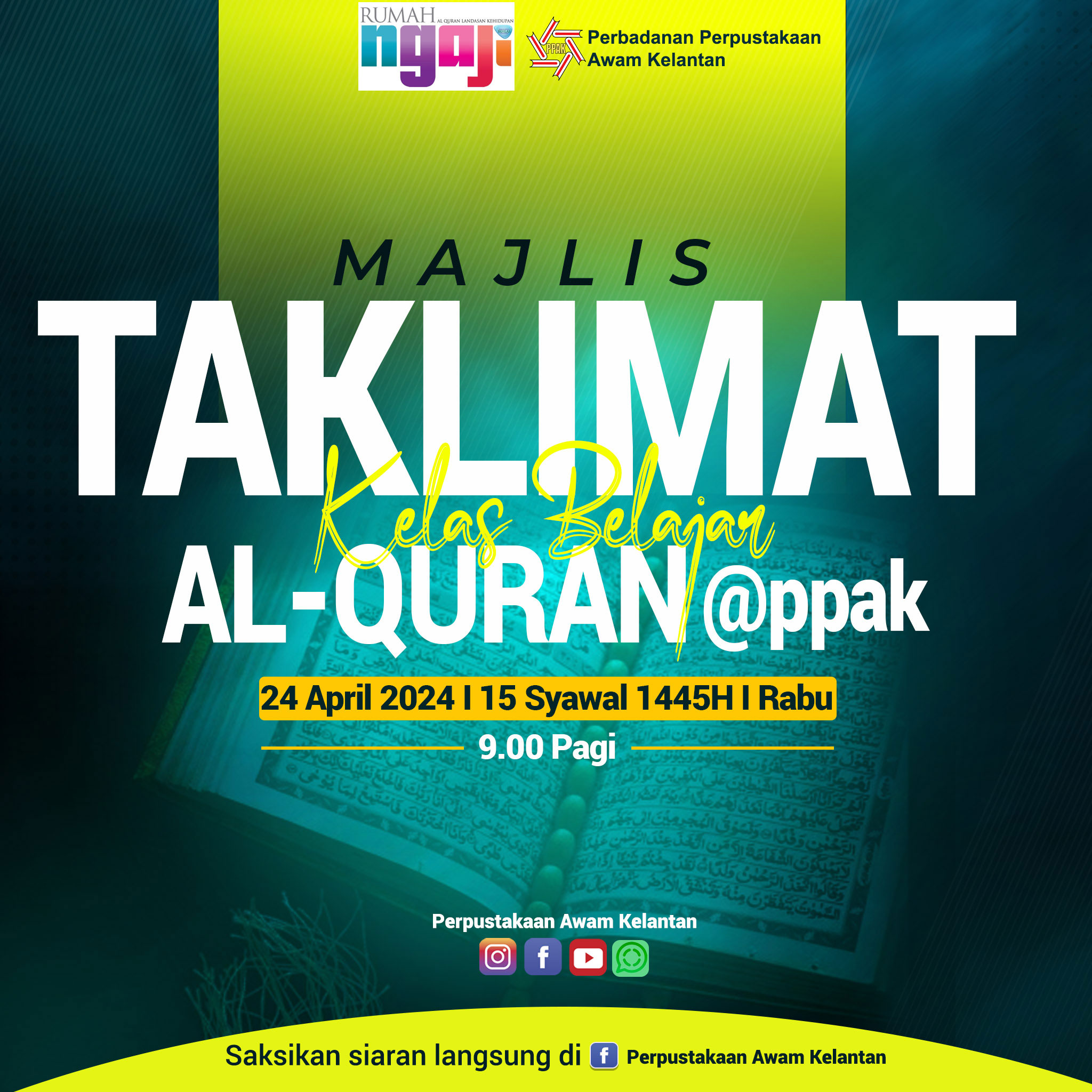 Majlis Taklimat Kelas Belajar Al-Quran @PPAK Written by Pentadbir on April 22, 2024. Posted in Arkib pengumuman aktiviti. Artikel hanya terdapat dalam bahasa Melayu | Article available only in Malay Program: Majlis Taklimat Kelas Belajar Al-Quran @PPAKTarikh: 24 April 2024Masa: 9:00 pagiTempat: Secara Langsung di Facebook Perpustakaan Awam Kelantan Prev Next