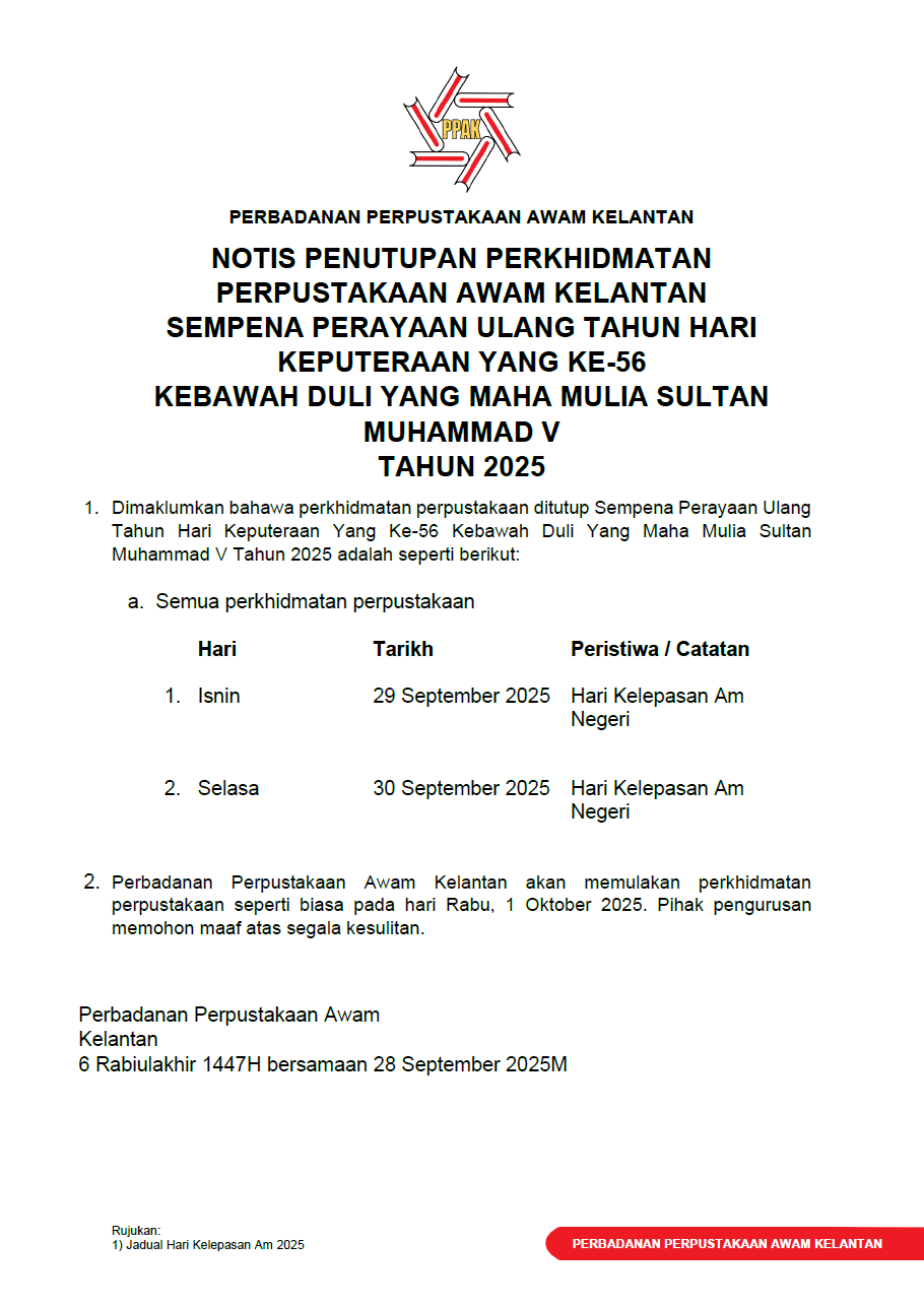 Notis penutupan perkhidmatan perpustakaan Sempena Perayaan Ulang Tahun Hari Keputeraan Yang Ke-56 Kebawah Duli Yang Maha Mulia Sultan Muhammad V Tahun 2025 Written by Pentadbir on September 28, 2025. Posted in Arkib pengumuman aktiviti. Artikel hanya terdapat dalam bahasa Melayu | Article available only in Malay Next